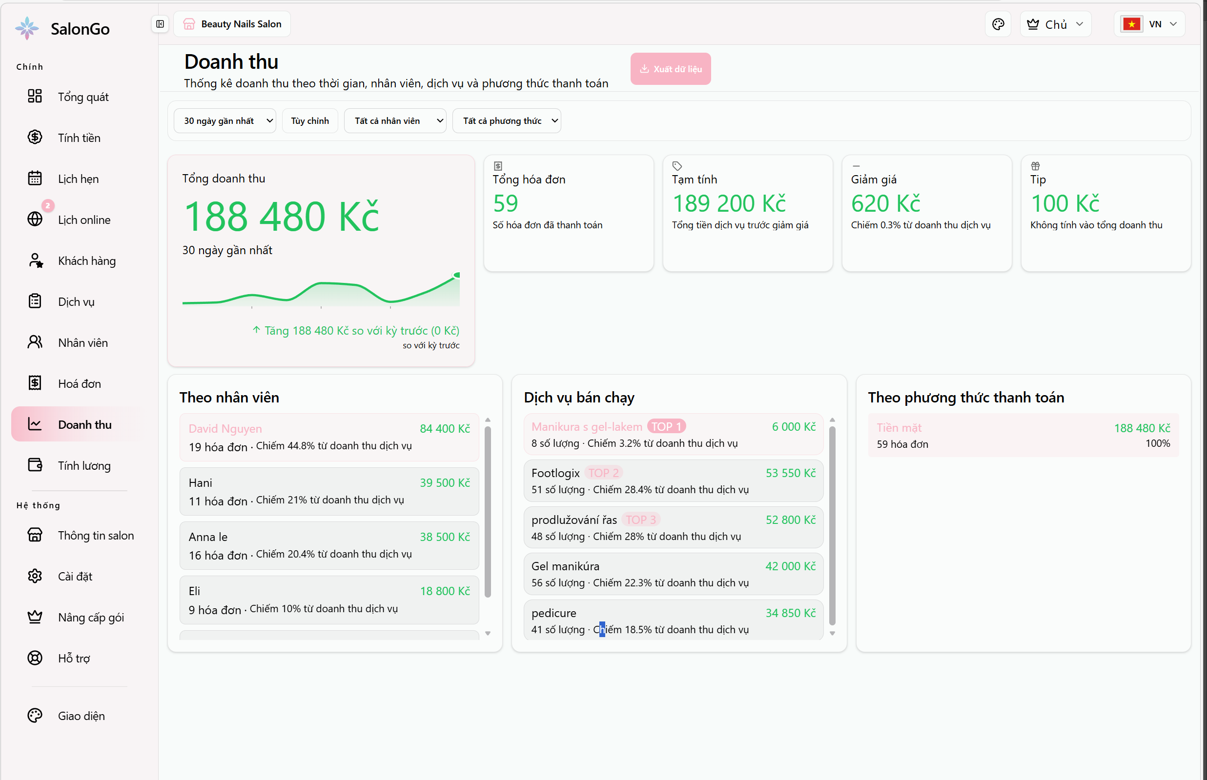 Báo cáo doanh thu theo ngày, tháng, theo thợ – quyết định kinh doanh dựa trên số liệu thật.
