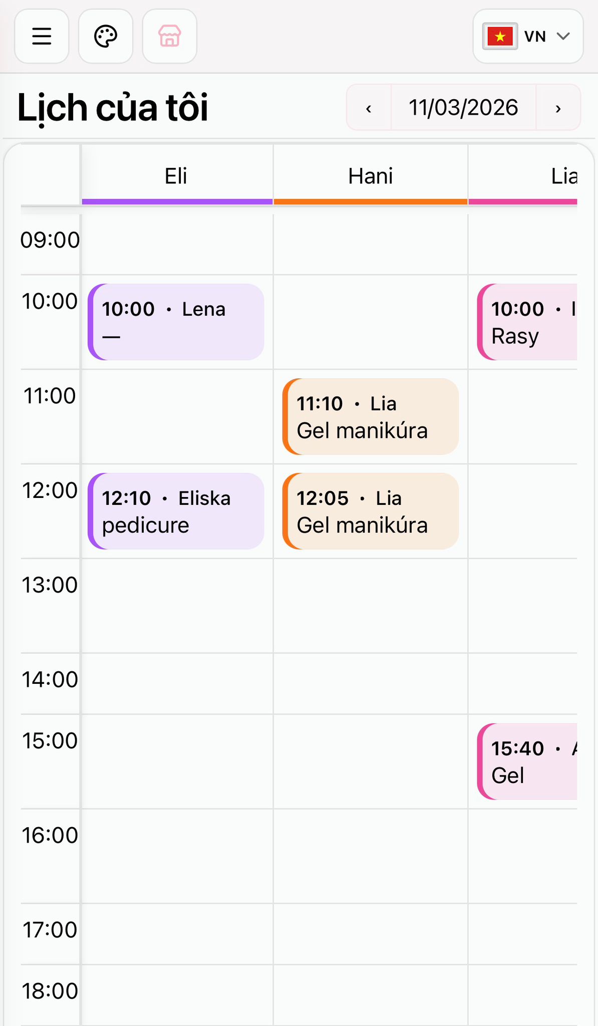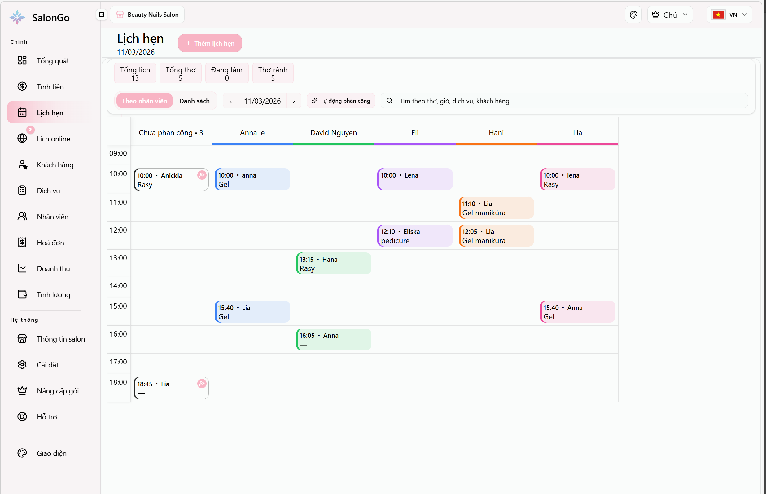 Quản lý lịch theo từng thợ, tránh trùng giờ, nhắc khách tự động – mọi thứ trong một màn hình.