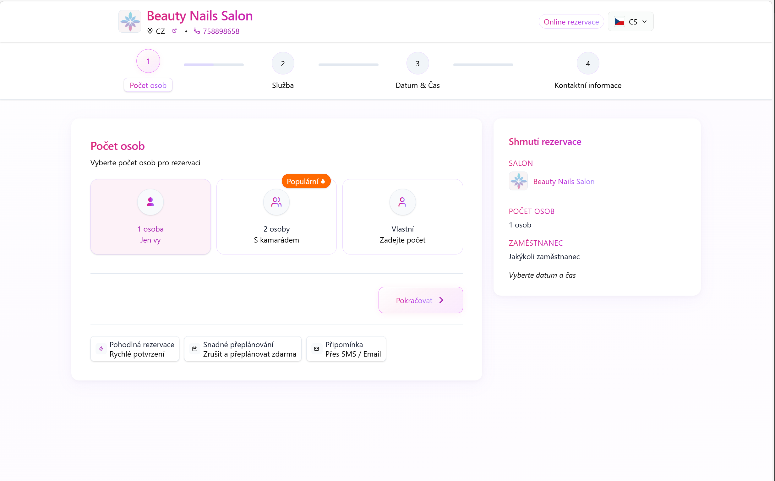 Mỗi salon có một trang đặt lịch riêng với đường link chuyên nghiệp – khách hàng có thể đặt lịch 24/7 chỉ trong vài bước đơn giản.